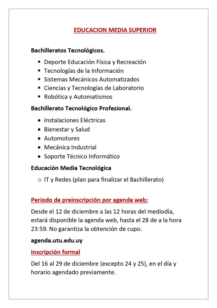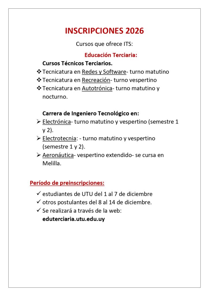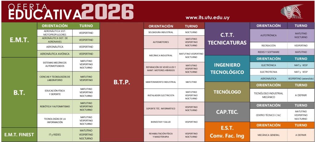 ÁREA INFORMÁTICA Curso Técnico Terciario Bachillerato Tecnológico Educación Media Tecnológica Bachillerato Técnico Profesional ÁREA RECREACIÓN, DEPORTE Y REHABILITACIÓN FÍSICA Bachillerato Tecnológico Bachillerato Técnico Profesional ÁREA MECÁNICA Curso Técnico Terciario Bachillerato Tecnológico Bachillerato Técnico Profesional Bachillerato Técnico Profesional Bachillerato Técnico Profesional ÁREA ELÉCTRICA Carrera de Ingeniero Tecnológico Bachillerato Técnico Profesional Bachillerato Tecnológico ÁREA CIENCIAS NATURALES Bachillerato Tecnológico ÁREA AERONAÚTICA Carrera de Ingeniero Tecnológico PROYECTO DE FORTALECIMIENTO DE INGLÉS Curso de Fortalecimiento del Inglés a contraturno para alumnos y funcionarios de ITS. CENTRO TÉCNICO C.N.C